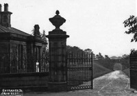 2024.133: Crow Nest entrance gate A photograph of the entrance to Crow Nest, a favoured home of Sir Titus Salt. One side of teh entrance lodge is visible next to an open metal gate and a roadway beyond. -