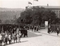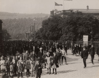 B1-032/5/10: Workers walking up Victoria Road (c 1920s) (1) A number of children can be seen in the front of the photograph. Very few of the faces can be clearly seen. A sign to the right says 'Anniversary Rev William Paxton' -