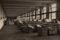 B1-032/4/3a: Wool sorting (2) Photograph shows a number of men standing in front of windows sorting wool. There are a number of baskets containing fleece with one in the centre of the room piled high. To the right are a number of sacks with two empty wicker baskets in front of them. -
