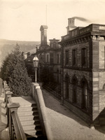 B1-032/5/1: Salts Mill offices from the steps Photograph shows the steps in the foreground with a lamp on the top of the steps. Trees are behind the steps. Salts Mill offices are to the right of the photograph -
