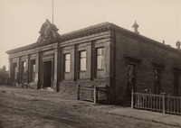 B1-032/5/12: Salts Mill Dining Room, Victoria Road (1) 3 laminated copies of the photo of A close up of the entrance to Salts Mill dining room. Two young men are visible in the doorway. A railway motice board is visible to the left with a notice saying 'Earlier holidays' -
