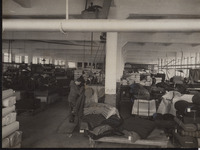 B1-032/4/39: Packing and despatch (2) Photograph shows piles of cloth both packed and unpacked. There are six packages to the left of the photograph with six piles of unwrapped cloth in the middle. A man stands to the left of some hats and coats with 3 dark suited men behind him and another man behind a table holding some cloth. -