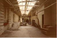 B1-032/5/42: Covered area between buildings Coloured photograph taken after the mill had closed down. It shows a covered passage connecting the original mill building (left) with an extension building (right). There are some red fire buckets on the left wall, a slope leading to the building on the left, a bench in the middle and piles of wood to the right. -
