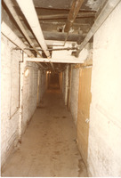 B1-032/5/45: Basement passageway The photograph was taken after the mill had closed down. It shows a passageway with brown coloured doors and pipes along the ceiling. -