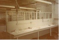 B1-032/5/53: Empty room with columns and table Coloured photograph taken after the mill had closed down. It shows an empty room with columns and tables. A blue coloured wall is to the right of the photograph. -