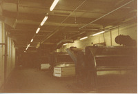 B1-032/5/50: Long room with columns (2) Original coloured photograph taken after the mill had closed down. It shows an empty room with windows down the left hand side and columns along the centre. The nearest column has a switch halfway up. -