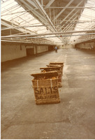 B1-032/5/52: Empty room with baskets (2) Coloured photograph taken after the mill had closed down. It shows a close up of the empty room with a glazed roof. Three wicker baskets, the first with 'Salts Saltaire' on the front, are in the middle of the floor. A man with a blue top is pushing a trolley at the rear of the photograph -