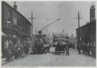 2024.56.8: Trolley bus overtaking a horse-drawn cart, Laisterdyke, 1914 Photograph shows a wide road with an early trolley bus on the left overtaking a horse-drawn cart laden with 4 large bales. A row of shops is visible on teh left. Both sides of teh streets are lined with people looking at the camera. -