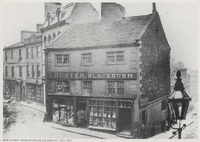 2024.56.7: Shop on the corner of Ivegate and Kirkgate, circa 1860 Photograph of a large, double-fronted building consisting of two shops at the corner of two streets in Bradford. A large sign 'T. Hunter' appears over the left-hand shop. A second sign 'Blackburn' appears above the shop on the right. The second shop has smaller signs 'Chemist and druggist' and 'Patent & proprietary medicines'. -