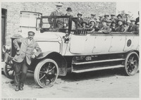 2024.56.9: Works outing aboard a charabanc, 1920 Photograph shows an open top small bus full of seated people on several rows. People appear to be well-dressed. The driver in a hat is stood at the front of the vehicle. -