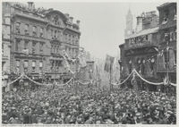 2024.56.6: Little Horton Lane Photograph of a large crowd of people completely filling a square on Little Horton Lane in Bradford on 4 May 1904 during a visit by the Prince and Princess of Wales. Bunting is hung at the sides of the streets. One building has a sign 'Appleton & Co.'. People are also visible in windows and on the roofs of buildings. -