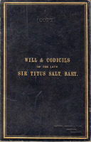 2018.40.2.1: Will of Sir Titus Salt A leather bound copy of the Will of Sir Titus Salt, this was created by the solicitors, possibly to give to the Executors. The dates of the documents and the executors names are laid out on the front page. The will is laid out with the wording in one column and a précis of the paragraph on the right hand side. -
