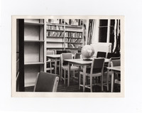 2019.46.17: Library/classroom corner Black and white photograph (16.5cmx12cm) of a corner of a library/classroom corner. Showng the tables and chairs with wall shelves behind with books on some of them. One window with curtains. A globe stands on one table in the middle of the photograph. Marked on reverse 'A. Anderson' -
