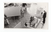 2019.46.13.3: Textile Display Black & white photograph of textile display with man on right taking a photo. May be linked to adult education classes ad appear to be in the Exhibition Road Building (see also 2019.46.14, 2019.46.13.1, 2019.46.13.2) -