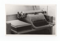2019.46.18: Typewriter Black and white photograph (13.5cmx8.5cm) of a typewriter 'Lexicon 80' and paper on a desk.