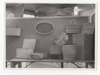 2019.46.14: Basketry Display One black and white photograph (16.5cmx12cm) of 9 items of basketry on display. This may be linked to adult education classes and appear to be in the Exhibition Road Building. (see also 2019.46.13, 2019.46.20) -