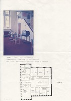2019.46.7: 1987 1st floor plan of college and a photo of the resource centre 1987 1st floor plan of college and a photo of part of the library resource centre and entrance to vice principals office. There is a black tv on a stand with 'sport headlines' on. A wooden chair with grey seat and back cover is placed in front of the TV. Behind the chair is two bookstands holding a variety of books. -