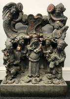 D3-117: Chinese Sculpture Chinese stone sculpture found during the excavations prior to building the greenhouses for Shipley College Gardens and horticulture students. It is believed that the sculpture was part of a Japanese Village which was part of the in the 1887 Royal Yorkshire Jubilee Exhibition. It is a Taoist scuplture depicting several deities, accourding to a letter from the Deputy Keeper of Ceramics in the Victoria and Albert Museum in 1968. From the left the deities are the Ch'ang the Moon Queen, Ch'ih-chang the Sun King, Shou Lau the God of Longevity with his deer and the central figure is Fu Hsing or Lu Hsingthe God of happiness or weath. -