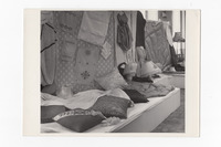 2019.46.20.2: Household textiles displays Black and white photograph (16.7cmx12.1cm) of display of household textiles including cushions, mats, lampshades, a dress, dressing gown, quilting etc. This is possibly part of an adult education classes display. See also 2019.46.13, 2091.46.14, 2019.46.20.1, 2019.46.20.3, 2019.46.20.4 -