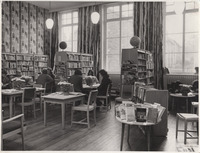 2019.46.3: People in the library Black & white photograph showing 7 adults reading in the library, 2 bookcases, 1 wall bookcase, 3 large windows. Possibly exhibition building for college. Possibly an early proof for the prospectus. -