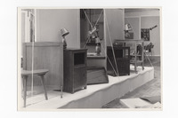 2019.46.20.3: Furniture Displays Black and white photograph (16.7cmx12.1cm) of display of furniture including wooden chairs, tables, tables with doors, and lampshades. The furniture is displayed on a raised platform.This is possibly part of an adult education classes display. See also 2019.46.13, 2091.46.14, 2019.46.20.1, 2019.46.20.2, 2019.46.20.4 -