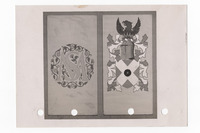 2019.46.19: Two crests Black and white photograph 15.2cmx10.8cm of two crests. One circular with S overlaying M in the centre and surrounded by leaves and flowers. The second showing a shield with a diagonal white cross and rose in the centre, topped by a helment ad a bird. Leaf decoration runs down the sides of this crest. Four holes have been punched along the bottom of the print. The printed image on the paper is 10cmx9.6cm -