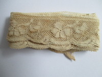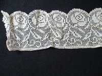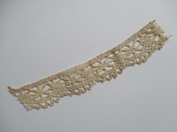 2016.2.36: Piece of cotton lace. Piece of heavy cotton, cream coloured lace trim. Straight top edge and scalloped lower edge. -