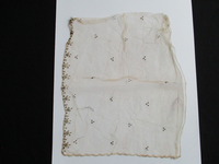 2016.2.31: Piece of cream silk embroidered netting. Piece of very fine cream netting embroidered with spots and 6 large flowers in a row. flowers. One edge is scalloped and bordered with a running leaf pattern. -