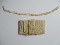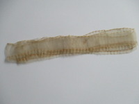 2016.2.34: Piece of cream silk edging/trim. Cream coloured silk trim/edging. Slightly ruched with darker cream stitching along one edge and finely hemmed on other long edge. -
