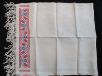 2016.2.3: Two fringed towels Two damask towels embroidered at each short edge with a flowing red and blue cross-stitched design on off-white background. 10 cm fringing to both short edges. -