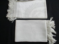 2016.2.4: Two fringed damask towels Two cream damask towels with an outer border of an arched design and inner border of flowing leaves. A floral design to the middle and then a centre decorated with spots. -