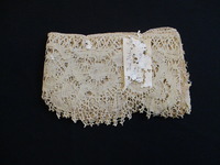2016.2.29: Length of cream lace edging/border. Length of cream lace edging/border, folded. One straight edge and one scallped edge. -