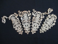 2016.2.37: Two pieces of cream silk lace. Two pieces of cream silk lace trim. Both of equal size and same design. Paisley and flower design with larger flowers to lower scalloped edge. -