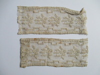 2016.2.44: Three pieces of cream silk lace trim. Three pieces of cream silk lace trim/edging. Netting decorated with silk thread. All of same design.