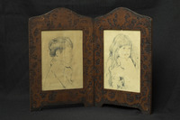 2018.9.6.2: double picture frame Hand made and hand decorated wooden hinged double picture frame. Contains two pencil sketches of a boy (with the letter K underneath on the frame) and a little girl (with the letter S underneath on the frame) who are possibly Isabel and Lawrence Salt. -