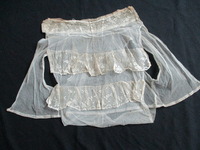 2016.2.8: Bib and Collar Cream lace/net bib and collar with armholes and fastenings to nape of neck and lower back. Item made from cream lace netting with a collar detailed with hand stitched silk flowers 2 sets of hooks and eyes and 3 waqvy wire stiffeners. Main body of garment has 2 lace frills in same design as collar. Double layer of netting to the front. -