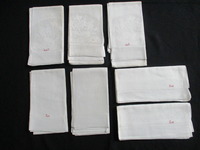 2016.2.5: Seven cream damask towels. Seven cream damask towels. Woven main body with floral borders to short ends. 4.5cm edging to short ends. Each towel has SALT embroidered in red on short edge to the right-hand corner. Brown spots and line staining to 2 towels -