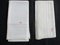 2016.2.6: Two damask towels. Two off-white damask towels with SALT embroidered in red. Line design 10cm from each short edge. Main body is a waffle design. 3cm plain edge on both short edges. -