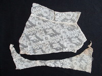 2016.2.46: Two pieces of cream silk lace. Two pieces of scrap silk lace, cut from clothing, both of same design. Silk decration on netting. Large flowers (3cm x 3cm) with trailing leaves set out in a lattice pattern. -