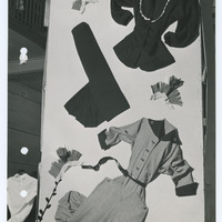 - Black and white photo shows an exhibition of needlework - dress, skirt and blouse. Dress chequered material, blouse and skirt plain dark material all mounted on board. 4 hole punches are on left of photograph