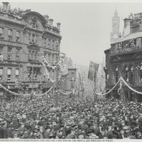 - Photograph of a large crowd of people completely filling a square on Little Horton Lane in Bradford on 4 May 1904 during a visit by the Prince and Princess of Wales. Bunting is hung at the sides of the streets. One building has a sign 'Appleton & Co.'. People are also visible in windows and on the roofs of buildings.