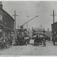 Trolley bus overtaking a horse-drawn cart, Laisterdyke, 1914 |