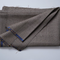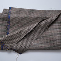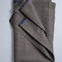 - A length of woven cloth produced at Salts MIll. The cloth has a dogtooth check pattern in beige, black and cream. There is a blue border on which gold-coloured lettering states 'All wool. Made in England'.