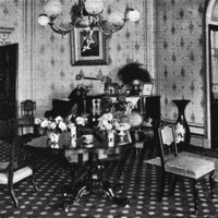 - A photograph of a room in Crow Nest, a favoured home of Sir Titus Salt. An oval table with flowers in jars is in the centre of the photograph. Open interior doors on teh left and right show other rooms.