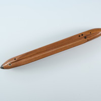 - A wooden shuttle with metal tips and an interior metal mechanism. The shuttle has a wide opening on top and a narrow opening on the bottom.