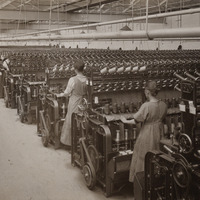 - Photograph shows spinning room with spinning machinery down the right hand side of the room. The backs of two women are visible with two others facing front at the rear of the photograph.