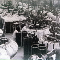 - Photograph shows several large woolcombing machines containing wool. Several workers, both male and female, are visible attending to the machines.