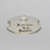 - China sugar bowl or conserve dish with lid marked 'A present from Saltaire' in gold.