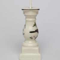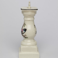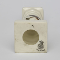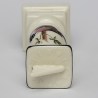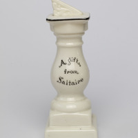 - China ornament decorated with a bird on one sidge and the words 'A gift from Saltaire' in black lettering.