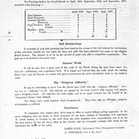 - Early report of the working of the Shipley School Board, chaired by Titus Salt Junior. Includes report of research on the deficient state of education in the Shipley area when it was founded and the steps the Board had taken to address these. Details on school fees, attendances over the three years, 'Salt scholarships' (funded by the Salt family), and the opening of evening schools in the Saltaire Instiute and Club. Also includes details of Titus Salt Junior's donation of 7016 square yards of land so tht a new elementary school could be built in Saltaire, what would become the home of the Albert Road School.